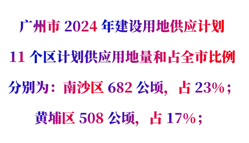 廣州市2024年建設(shè)用地供應(yīng)計劃(含工業(yè)用地):2024年,廣州計劃供地3019公頃,工業(yè)用地1300公頃,占比43%。