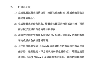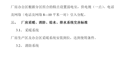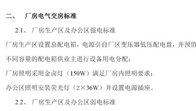 工業(yè)廠房土建、水暖電交房標準: 一、廠房土建鋼構交房標準 二、廠房電氣交房標準 三、廠房采暖、消防、給水、排水系統(tǒng)交房標準 四、標準廠房租賃物業(yè)費