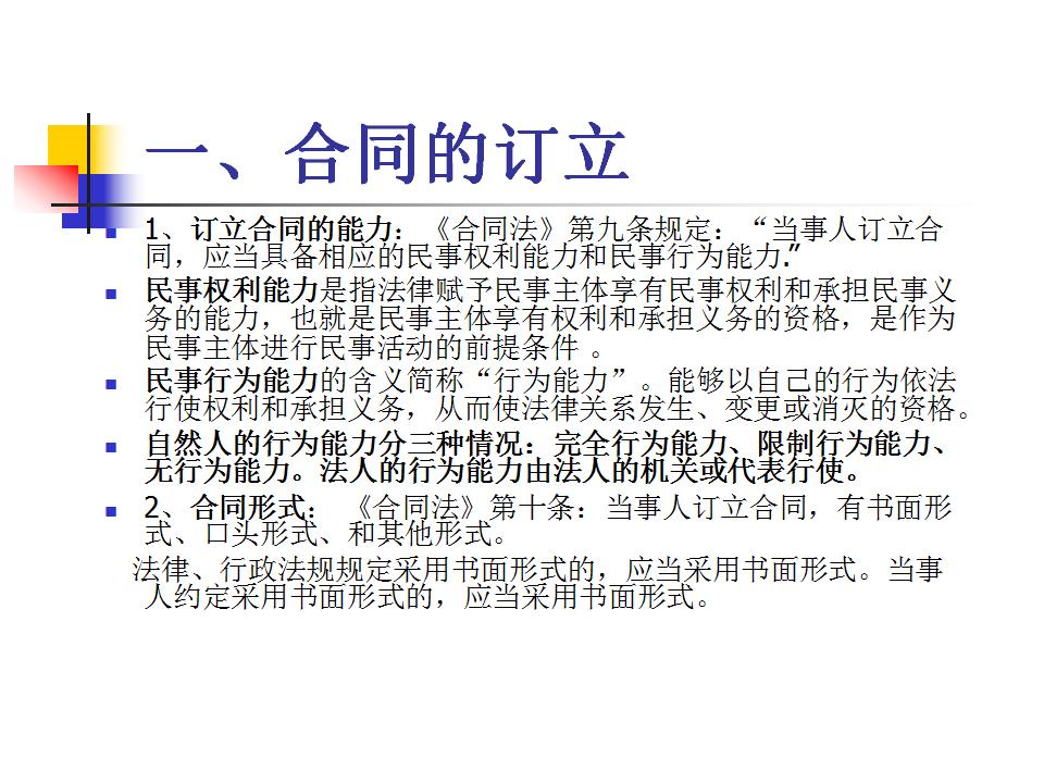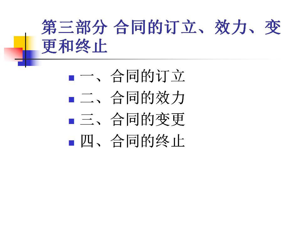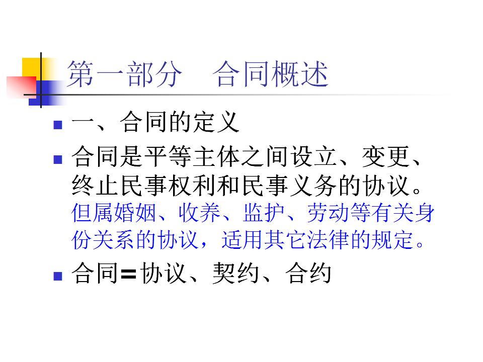 合同基礎(chǔ)知識及簽署注意事項(xiàng)指引: 第一篇 合同基礎(chǔ)知識培訓(xùn) 第一部分 合同概述 第二部分 合同的訂立、效力、變更和終止 第三部分 合同基本法律概念的區(qū)分 第二篇 合同簽署指引培訓(xùn) 第一部分 合同主要風(fēng)險(xiǎn)點(diǎn) 第二部分 合同審批制度的優(yōu)化