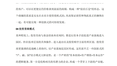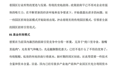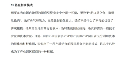 產(chǎn)業(yè)園區(qū)招商九大創(chuàng)新模式 01 基金招商模式 02 聯(lián)合招商模式 03 反向操作模式 04 投資營商模式 05 雙向?qū)α髂J?06 眾創(chuàng)孵化模式 07“互聯(lián)網(wǎng)+”模式 08 整體搬遷模式 09 招商服務(wù)機(jī)構(gòu)