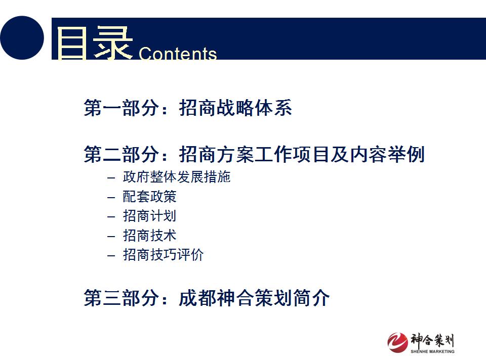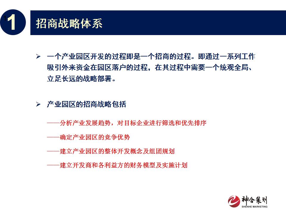 產(chǎn)業(yè)園區(qū)招商策劃方案,供參考。 第一部分:招商戰(zhàn)略體系 第二部分:招商方案工作項目及內(nèi)容舉例 第三部分:成都神合策劃簡介