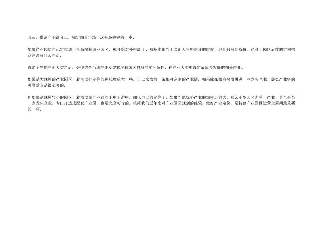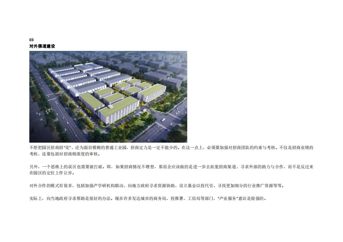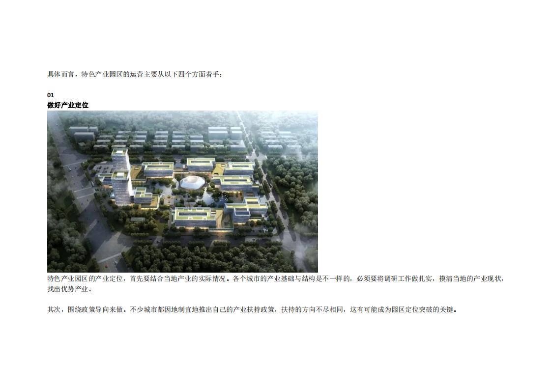 特色產(chǎn)業(yè)園區(qū)運(yùn)營(yíng)與規(guī)劃定位: 01做好產(chǎn)業(yè)定位 02做好產(chǎn)品規(guī)劃 03對(duì)外渠道建設(shè) 04突出產(chǎn)業(yè)服務(wù)