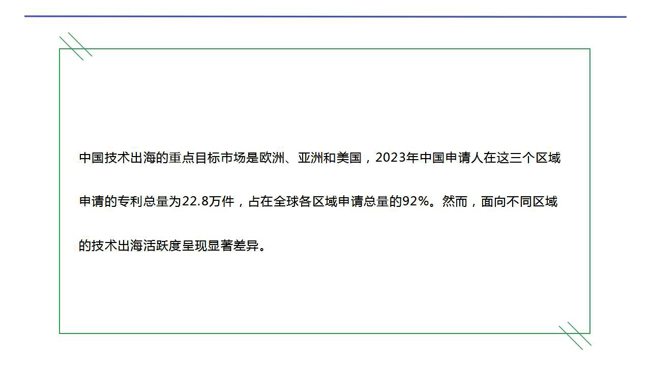 2023年新能源汽車產業(yè)技術出海研究報告:中國技術出海的重點目標市場是歐洲、亞洲和美國,2023年中國申請人在這三個區(qū)域申請的專利總量為22.8萬件,占在全球各區(qū)域申請總量的92%。然而,面向不同區(qū)域的技術出?;钴S度呈現(xiàn)顯著差異。
