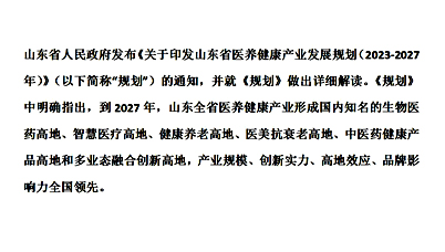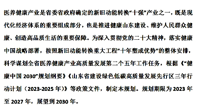 2023-2027年山東省醫(yī)養(yǎng)健康產(chǎn)業(yè)重點領(lǐng)域發(fā)展規(guī)劃分析:根據(jù)《“健康中國2030”規(guī)劃綱要》《山東省建設(shè)綠色低碳高質(zhì)量發(fā)展先行區(qū)三年行動計劃(2023-2025年)》等政策文件,制定本規(guī)劃。規(guī)劃期限為2023年至2027年,展望到2030年。