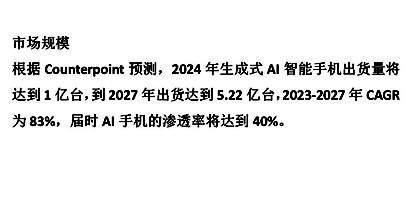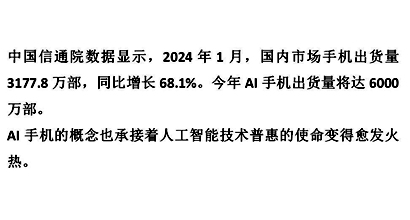 2024年智能AI手機產(chǎn)業(yè)鏈梳理分析:中國信通院數(shù)據(jù)顯示,2024年1月,國內(nèi)市場手機出貨量3177.8萬部,同比增長68.1%。今年智能AI手機出貨量將達6000萬部。