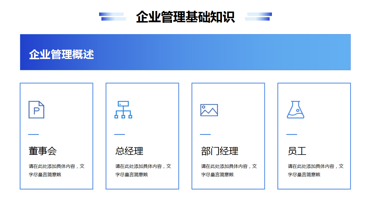 適用:企業(yè)管理基礎(chǔ)知識培訓(xùn) 風(fēng)格類型:藍(lán)色商務(wù) 所有文字、圖片內(nèi)容可修改調(diào)整
