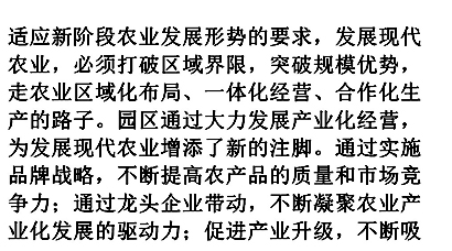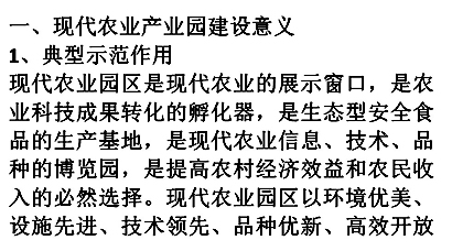 現(xiàn)代農(nóng)業(yè)產(chǎn)業(yè)園的五大運(yùn)營(yíng)模式:現(xiàn)代農(nóng)業(yè)園區(qū)是現(xiàn)代農(nóng)業(yè)的展示窗口,是農(nóng)業(yè)科技成果轉(zhuǎn)化的孵化器,是生態(tài)型安全食品的生產(chǎn)基地,是現(xiàn)代農(nóng)業(yè)信息、技術(shù)、品種的博覽園,是提高農(nóng)村經(jīng)濟(jì)效益和農(nóng)民收入的必然選擇。