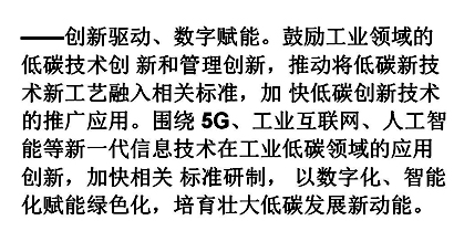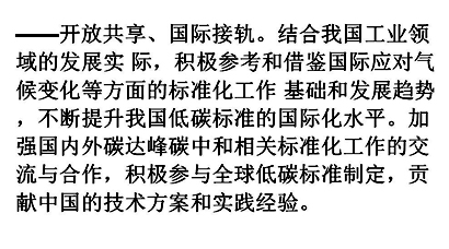 到2030 年,形成較為完善的工業(yè)領(lǐng)域碳達(dá)峰碳中和標(biāo)準(zhǔn)體系,加快制定協(xié)同降碳、碳排放管理、低碳評(píng)價(jià)類(lèi)標(biāo)準(zhǔn),實(shí)現(xiàn)重點(diǎn)行業(yè)重點(diǎn)領(lǐng)域標(biāo)準(zhǔn)全覆蓋,支撐工業(yè)領(lǐng)域碳排放全面達(dá)峰,標(biāo)準(zhǔn)化工作重點(diǎn)逐步向碳中和目標(biāo)轉(zhuǎn)變。