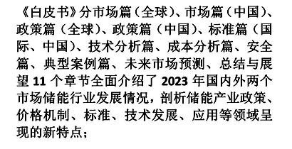 2024年中國新型儲能產業(yè)發(fā)展白皮書:分市場篇(全球)、市場篇(中國)、政策篇(全球)、政策篇(中國)、標準篇(國際、中國)、技術分析篇、成本分析篇、安全篇、典型案例篇、未來市場預測、總結與展望11個章節(jié)全面介紹了2023年國內外兩個市場儲能行業(yè)發(fā)展情況,剖析儲能產業(yè)政策、價格機制、標準、技術發(fā)展、應用等領域呈現(xiàn)的新特點;在產能過剩、行業(yè)洗牌的背景下,白皮書針對儲能行業(yè)健康有序發(fā)展提出6點建議。
