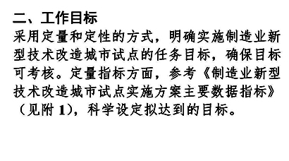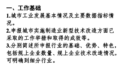 由省級工業(yè)和信息化、財政部門組織城市申報。申報城市應編制實施方案,實施期為2-3年,應包括工作基礎、工作目標、實施內(nèi)容、項目總體情況、資金使用方向、考核指標、保障措施、其他材料及項目清單等內(nèi)容,并附相關證明材料(參考附件)。