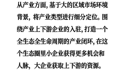 產(chǎn)業(yè)園運(yùn)營(yíng)管理手冊(cè):從產(chǎn)業(yè)方面,基于大的區(qū)域市場(chǎng)環(huán)境背景,將產(chǎn)業(yè)類型進(jìn)行細(xì)分定位。圍繞產(chǎn)業(yè)上下游企業(yè)的入駐,打造一個(gè)全生態(tài)全生命周期的產(chǎn)業(yè)閉環(huán),在這個(gè)生態(tài)圈里小企業(yè)獲得更多機(jī)會(huì)和人脈,大企業(yè)獲取上下游的資源。