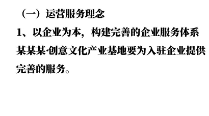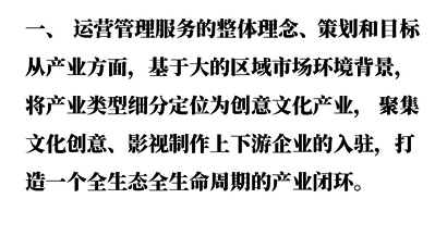 創(chuàng)意文化產(chǎn)業(yè)基地運營管理參考方案:明確發(fā)展目標(biāo):為文化產(chǎn)業(yè)園區(qū)提供清晰的發(fā)展方向和目標(biāo),幫助園區(qū)管理者和利益相關(guān)者達(dá)成共識。優(yōu)化資源配置:指導(dǎo)園區(qū)如何更有效地利用和分配資源,包括資金、人才、技術(shù)等,以實現(xiàn)最大化的經(jīng)濟效益和社會效益。促進產(chǎn)業(yè)集聚:通過吸引和培育文化企業(yè),形成具有競爭力的產(chǎn)業(yè)集群,增強園區(qū)的產(chǎn)業(yè)吸引力和輻射力。提升品牌價值:通過品牌建設(shè)和營銷活動,提高園區(qū)的知名度和影響力,吸引更多的投資和游客。創(chuàng)新商業(yè)模式:探索和實施創(chuàng)新的商業(yè)模式,為園區(qū)帶來多元化的收入來源,提高盈利能力和可持續(xù)發(fā)展能力。增強運營效率:通過科學(xué)的管理和運營,提高園區(qū)的運營效率,降低運營成本。