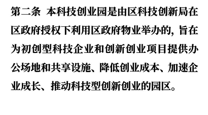 科技創(chuàng)業(yè)園園區(qū)管理辦法:為規(guī)范本科技創(chuàng)業(yè)園的使用和管理, 充分發(fā)揮創(chuàng)業(yè)園對科技企業(yè)和創(chuàng)業(yè)人才的聚集作用,提升創(chuàng)業(yè)園的管理和服水平,促進(jìn)科技創(chuàng)新發(fā)展