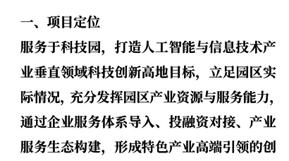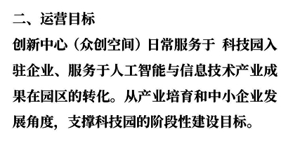 科技園創(chuàng)新中心(眾創(chuàng)空間)運(yùn)營(yíng)方案:服務(wù)于科技園,打造人工智能與信息技術(shù)產(chǎn)業(yè)垂直領(lǐng)域科技創(chuàng)新高地目標(biāo),立足園區(qū)實(shí)際情況,充分發(fā)揮園區(qū)產(chǎn)業(yè)資源與服務(wù)能力,通過(guò)企業(yè)服務(wù)體系導(dǎo)入、投融資對(duì)接、產(chǎn)業(yè)服務(wù)生態(tài)構(gòu)建,形成特色產(chǎn)業(yè)高端引領(lǐng)的創(chuàng)新創(chuàng)業(yè)服務(wù)平臺(tái),助力 科技園延展產(chǎn)業(yè)服務(wù)鏈條。