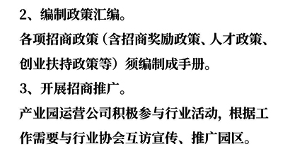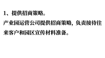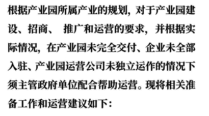 新產(chǎn)業(yè)園運營準(zhǔn)備指導(dǎo)手冊:根據(jù)產(chǎn)業(yè)園所屬產(chǎn)業(yè)的規(guī)劃,對于產(chǎn)業(yè)園建設(shè)、招商、 推廣和運營的要求,并根據(jù)實際情況,在產(chǎn)業(yè)園未完全交付、企業(yè)未全部入駐、產(chǎn)業(yè)園運營公司未獨立運作的情況下須主管政府單位配合幫助運營。