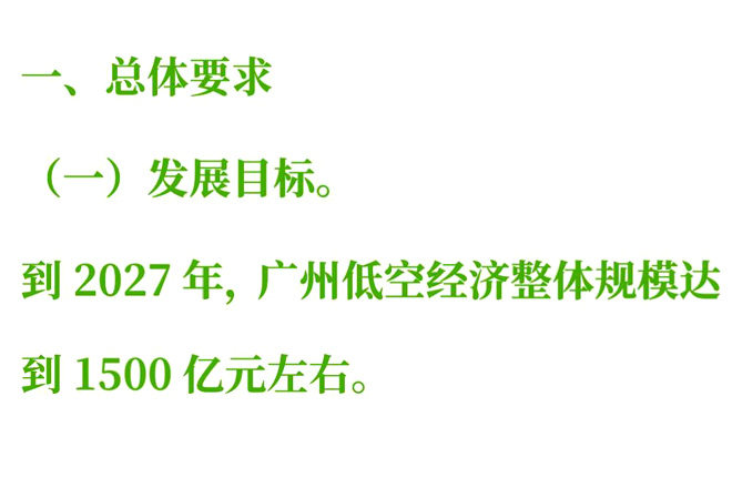 廣州市低空經(jīng)濟(jì)發(fā)展實(shí)施方案:到2027年,廣州低空經(jīng)濟(jì)整體規(guī)模達(dá)到1500億元左右。通航基礎(chǔ)設(shè)施和飛行環(huán)境明顯改善,以高端智能制造業(yè)為主導(dǎo)的產(chǎn)業(yè)體系初步形成,低空空域管理改革取得成效,低空飛行服務(wù)保障能力明顯提升,低空領(lǐng)域技術(shù)創(chuàng)新水平全國領(lǐng)先。