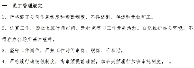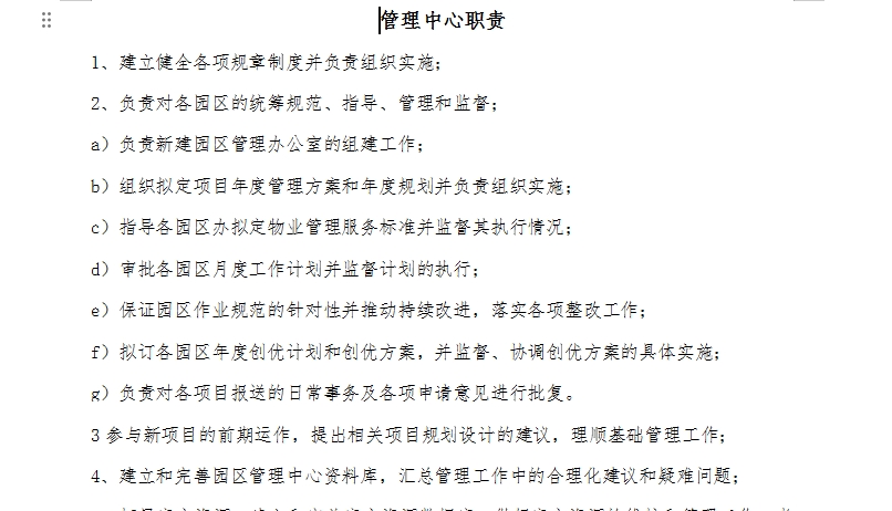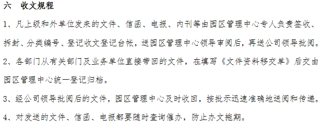 工業(yè)園區(qū)管理中心管理手冊: 一 員工管理規(guī)定 二 辦公用品管理規(guī)定 三 計算機管理規(guī)定 四 公章管理規(guī)定 五 發(fā)文規(guī)定 六 收文規(guī)程 七 檔案管理規(guī)定 八 檔案保管規(guī)程 九 檔案借閱規(guī)定 十 服裝管理規(guī)定