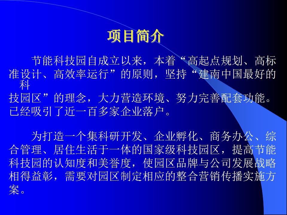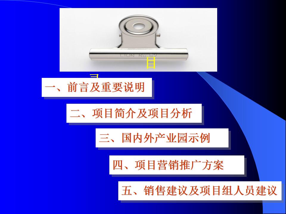 廣州天安番禺節(jié)能科技園策劃推廣方案PPT 一、前言及重要說明 二、項(xiàng)目簡介及項(xiàng)目分析 三、國內(nèi)外產(chǎn)業(yè)園示例 四、項(xiàng)目營銷推廣方案 五、銷售建議及項(xiàng)目組人員建議