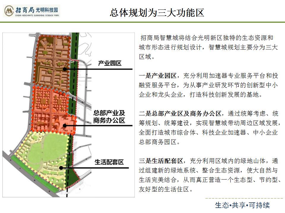 三、總體規(guī)劃為三大功能區(qū):招商局智慧城將結合光明新區(qū)獨特的生態(tài)資源和城市形態(tài)進行規(guī)劃設計,智慧城規(guī)劃主要分為三大區(qū)域。