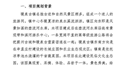古鎮(zhèn)文化產(chǎn)業(yè)園區(qū)項目建議書:以河北省蔚縣暖泉古鎮(zhèn)文化產(chǎn)業(yè)園區(qū)為例參考 第一章項目概述 第二章項目規(guī)劃背景及必要性 第三章項目市場分析與前景展望 第四章項目建設內(nèi)容及規(guī)模 第五章結(jié)論與建議 第六章項目聯(lián)系