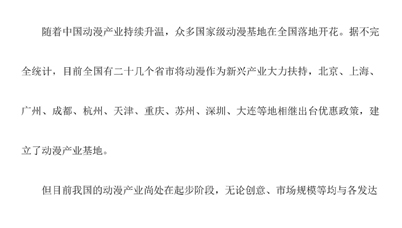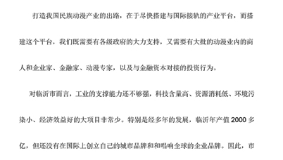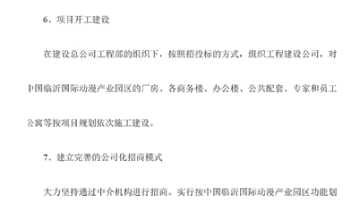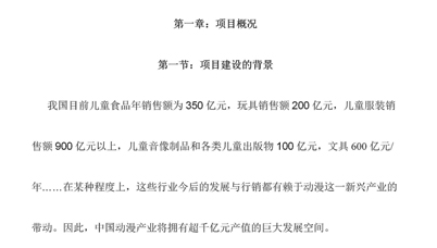 動(dòng)漫產(chǎn)業(yè)園項(xiàng)目可行性研究報(bào)告(中國(guó)臨沂): 01項(xiàng)目概況 02項(xiàng)目實(shí)施方案 03項(xiàng)目主要經(jīng)濟(jì)技術(shù)指標(biāo) 04投資估算及其資金籌資 05經(jīng)濟(jì)效益分析 06項(xiàng)目可行性報(bào)告的編制說明 07項(xiàng)目可行性報(bào)告的專家論證 ......