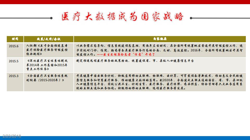 健康醫(yī)療大數(shù)據(jù)產(chǎn)業(yè)現(xiàn)狀趨勢(shì)及標(biāo)桿分析研究(2018年),供參考。 一、政策解讀 二、醫(yī)療行業(yè)痛點(diǎn) 三、大數(shù)據(jù)醫(yī)療發(fā)展現(xiàn)狀 四、大數(shù)據(jù)醫(yī)療發(fā)展趨勢(shì) 五、標(biāo)桿分析