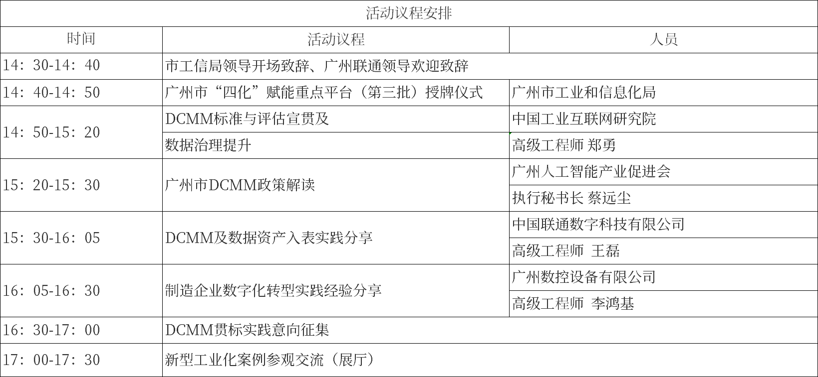 本次活動將舉行廣州市“四化”賦能重點平臺(第三批)授牌儀式,邀請智能制造行業(yè)龍頭示范企業(yè)、行業(yè)專家、技術(shù)賦能企業(yè)等圍繞DCMM貫標(biāo)及數(shù)字化轉(zhuǎn)型實踐、經(jīng)驗、發(fā)展思路等進(jìn)行現(xiàn)場分享,圍繞數(shù)據(jù)對產(chǎn)業(yè)發(fā)展的賦能作用進(jìn)行研討交流,相關(guān)媒體將對活動過程進(jìn)行跟蹤報道。