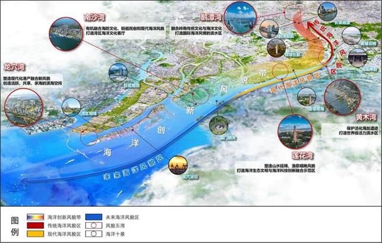 營造活力繽紛的海洋城市風(fēng)貌,以海洋作為濱海空間風(fēng)貌體系的主界面,鏈接沿岸山體、河流、城市景觀,挖掘歷史,人文,產(chǎn)業(yè)特色,打造“一帶三區(qū)五灣十景”特色海洋城市風(fēng)貌體系,充分展現(xiàn)廣州的“海洋味、嶺南風(fēng)、水鄉(xiāng)韻,創(chuàng)新范”。