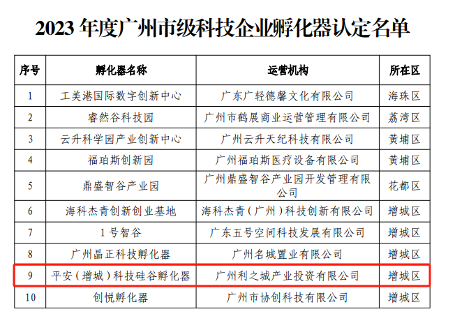 平安(增城)科技硅谷:平安(增城)科技硅谷獲廣州市科技局認(rèn)定為“2023年度市級(jí)科技企業(yè)孵化器”。