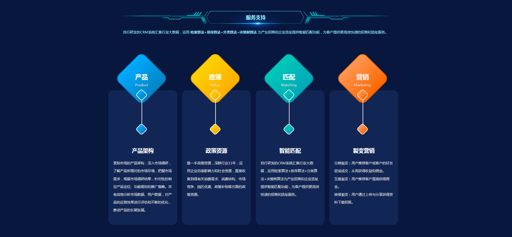 以海量數(shù)據(jù)庫(kù)為支撐,為企業(yè)方、項(xiàng)目方、中介方等提供更優(yōu)質(zhì)的選擇和資源,推動(dòng)產(chǎn)業(yè)行業(yè)向前發(fā)展。