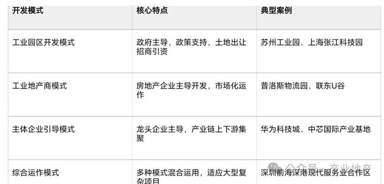 產(chǎn)業(yè)地產(chǎn)的開發(fā)模式主要包括工業(yè)園區(qū)開發(fā)模式、工業(yè)地產(chǎn)商模式、主體企業(yè)引導(dǎo)模式和綜合運作模式 。其中,工業(yè)園區(qū)開發(fā)模式是目前中國各級地方政府最常使用的工業(yè)地產(chǎn)開發(fā)模式,也是中國工業(yè)地產(chǎn)市場的主要載體 。