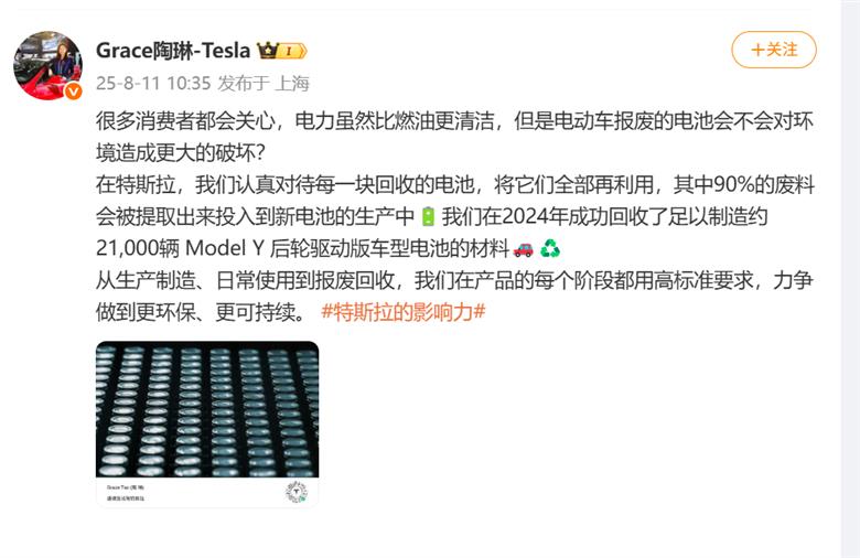 【陶琳談特斯拉電池回收:提取每塊電池90%廢料,投入新電池生產(chǎn)中】特斯拉公司全球副總裁陶琳發(fā)文稱,特斯拉認真對待每一塊回收的電池,將它們全部再利用,其中90%的廢料會被提取出來投入到新電池的生產(chǎn)中。她提到,2024年,特斯拉成功回收了足以制造約21000輛Model Y后輪驅動版車型電池的材料。(每日經(jīng)濟新聞)